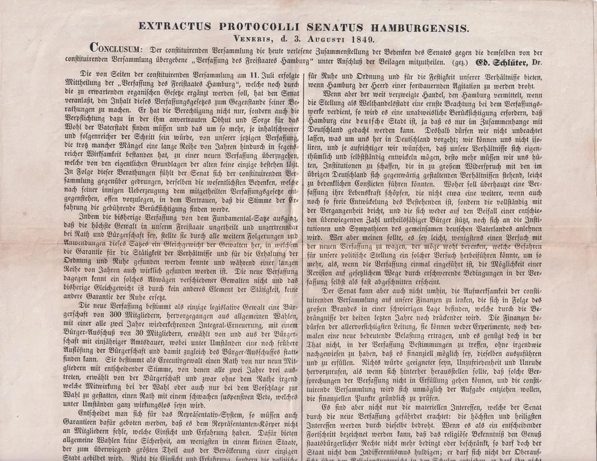 Conclusum: Der constituirenden Versammlung die heute verlesene Zusammenstellung der Bedenken des Senates gegen die demselben von der constituirenden Versammlung übergebene "Verfassung des Freistaates Hamburg unter Anschluß der Beilagen mitzutheilen. (gez.) Ed. Schlüter. - "Die neue Verfassung bestimmt als einzige legislative Gewalt eine Bürgerschaft von 300 Mitgliedern, hervorgegangen aus allgemeinen Wahlen, ... Sie bestimmt als Executivgewalt einen Rath von nur neun Mitgliedern mit entscheidender Stimme, ... erwählt von der Bürgerschaft..." - Aus dem "Hamb. unparth. Corresp. v. 7. Aug. 1849". - Zu dem Juristen Eduard Schlüter (geb. 1791) siehe Schröder 3477. - Mit Kreuzbugfalten, leicht braunfleckig. - Aus der Hamburgensien-Sammlung Carl Thinius