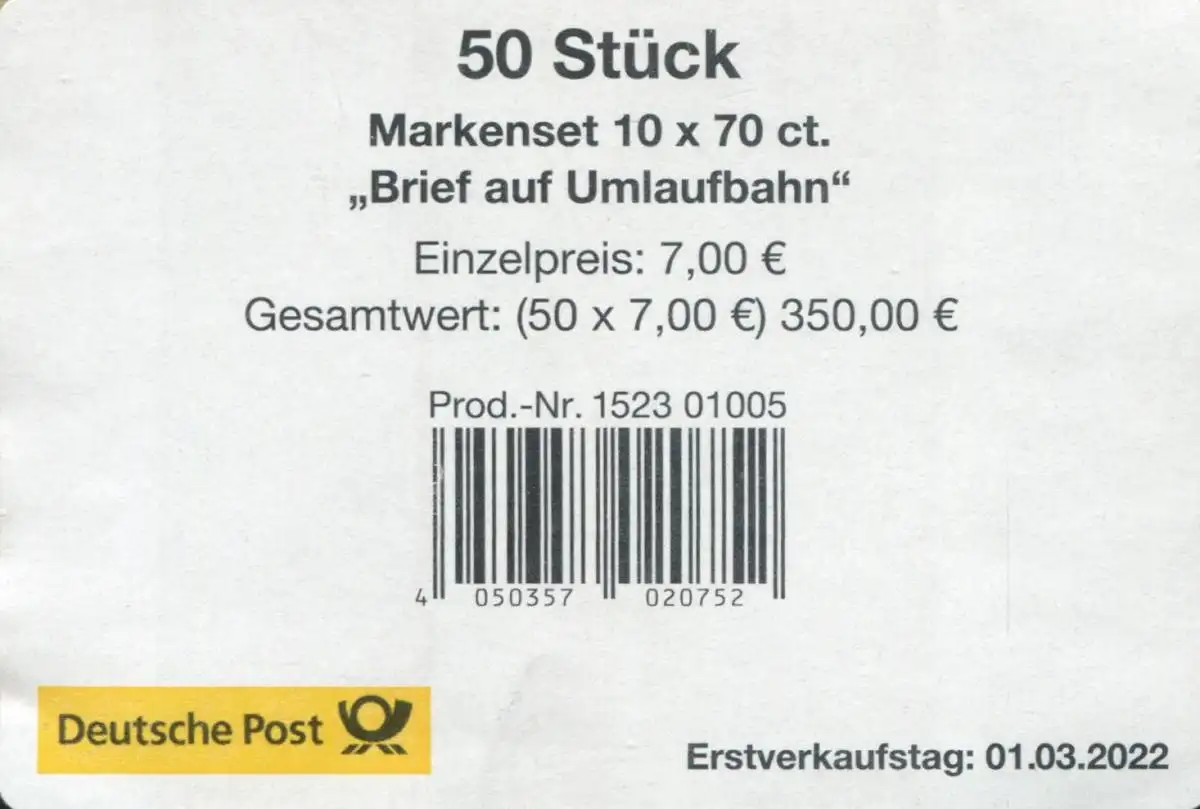 Dauerserie Welt der Briefe: Brief auf Umlaufbahn / Produktnummer: 1523 01005, Druckerei Bagel / Mönchengladbach