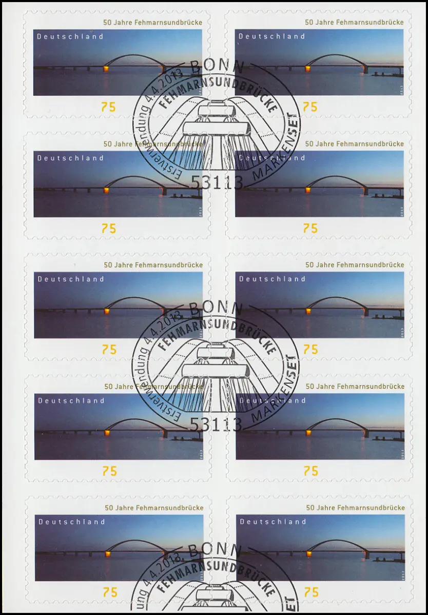 FB 29 Fehmarnsundbrücke, Folienblatt 10x3003, Erstverwendungsstempel Bonn 4.4.13