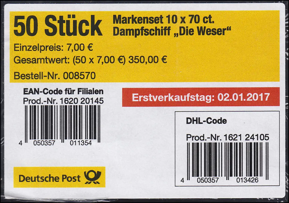 FB 62 Dampfschiff Die Weser 2017, Folienblatt-BANDEROLE mit DHL-Code