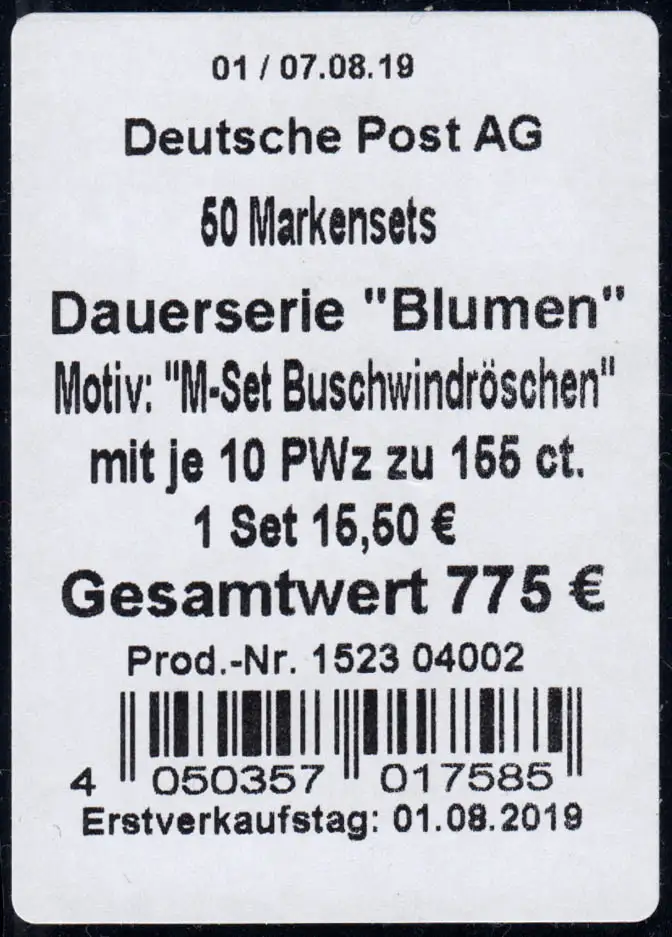 Auflage a Bundesdruckerei Berlin Produktnummer 1523 04002, Banderole mit Zusatzzeile "Deutsche Post AG"