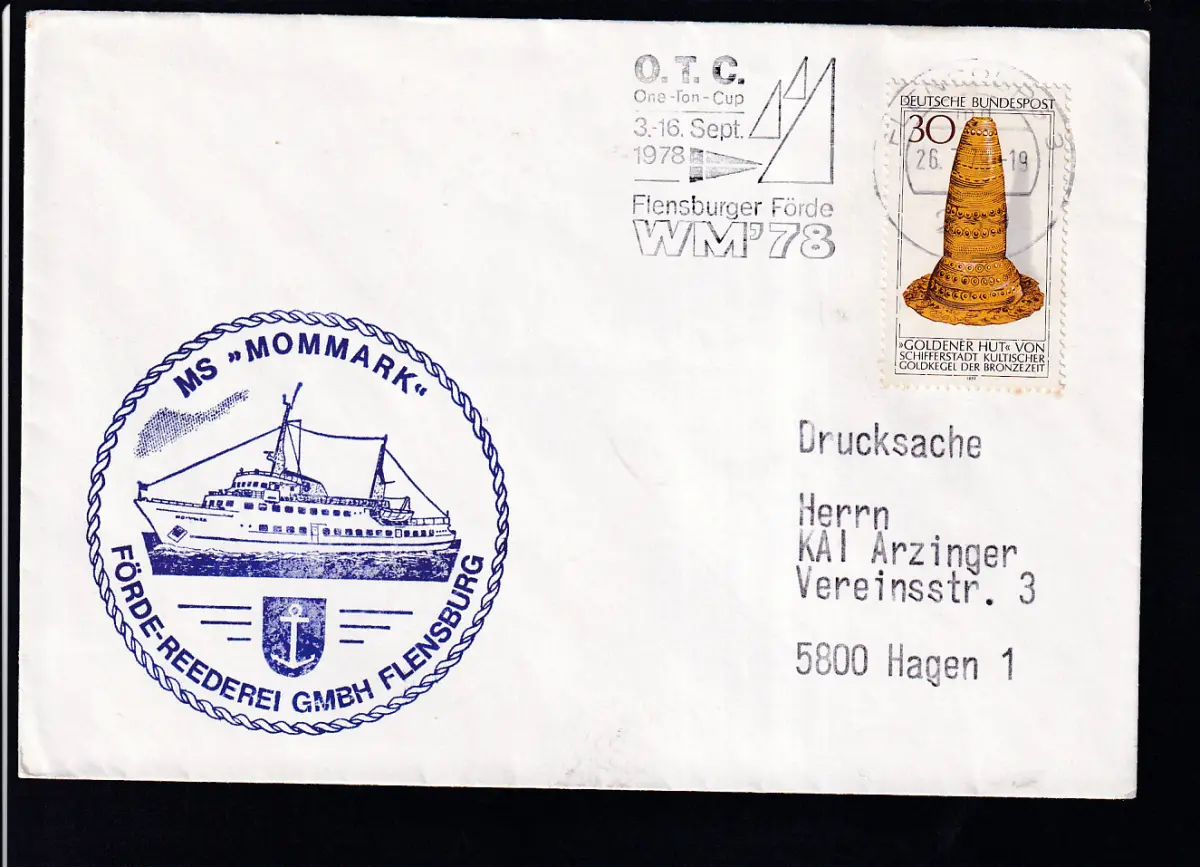 FLENSBURG 239 O.T.C. One-Ton-Cup 3.-16.Sept. 1978 Flensburger Förde WM'78 + Cachet MS "Nommark" auf Brief