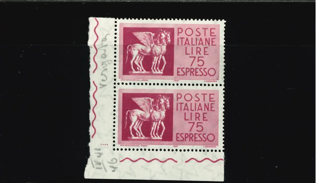 MNH - Vollgummi - FLÜGELPFERDE 75 L. WEISSER PUNKT ZWISCHEN SCHWANZ UND PFERD POS 41 PAAR MIT NORMALEM VERGATA-PAPIER Cod. ITAV_1462
