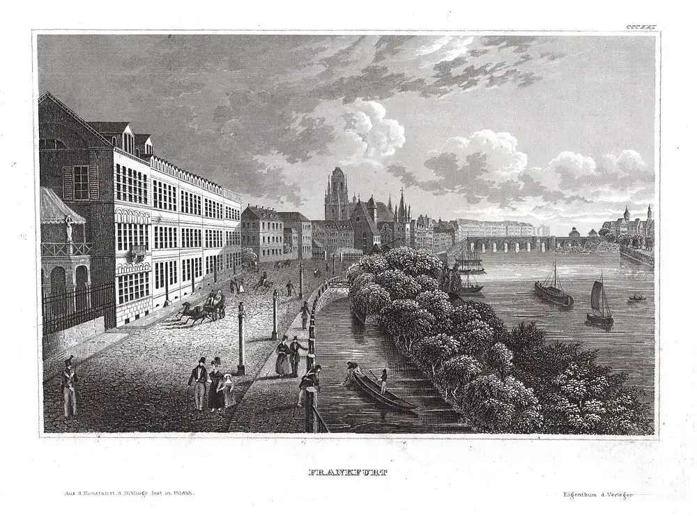 FRANKFURT / Main. vom Mainufer aus. Originaler Stahlstich um 1840