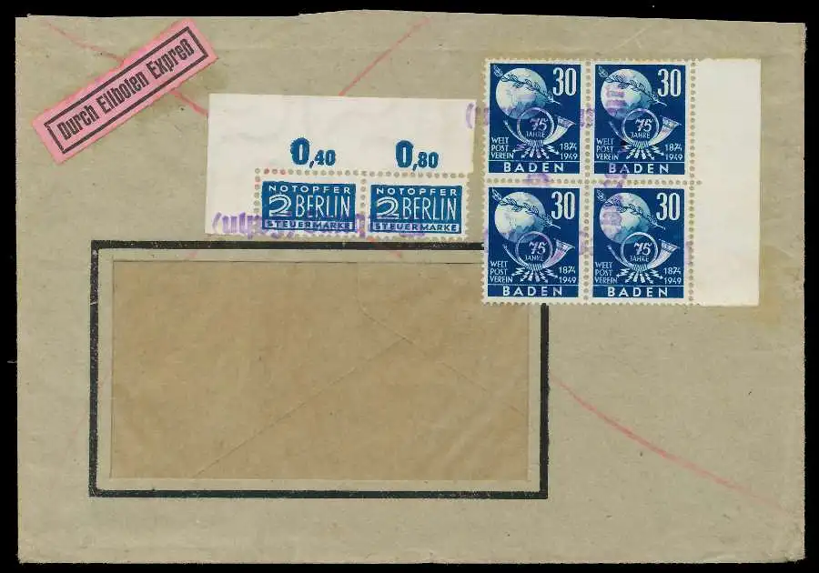 FRANZ. ZONE BADEN Nr 57 BRIEF MEF VIERERBLOCK 78FFDE