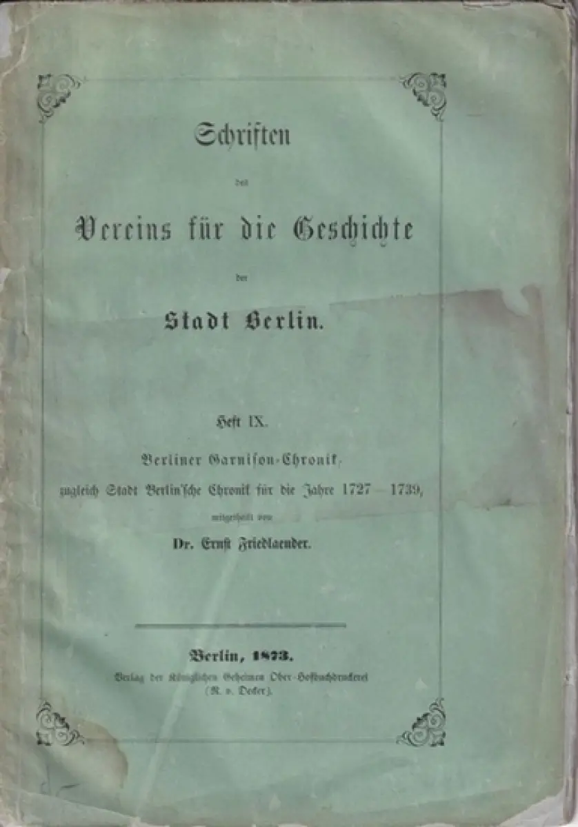 Titel: Berliner Garnison-Chronik, zugleich Stadt Berlin'sche Chronik für die Jahre 1727 - 1739, mitgetheilt von ERNST FRIEDLAENDER (= SCHRIFTEN DES VEREINS FÜR DIE GESCHICHTE DER STADT BERLIN. Heft IX)