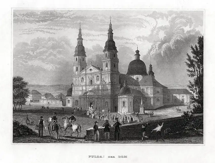 FULDA - Der Dom mit Prozession. Echter Stahlstich um 1850
