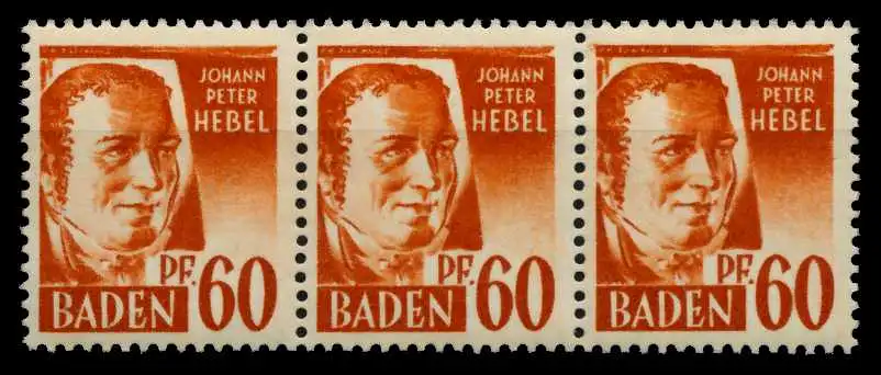 60 Pfg Freimarken Persönlichkeiten und Ansichten aus Baden 1. Ausgabe, 3er Streifen mit allen drei Typen (Reihe 4, 5 und 6 ) Type II + I + III