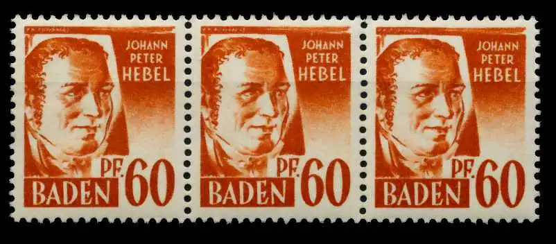 60 Pfg Freimarken Persönlichkeiten und Ansichten aus Baden 1. Ausgabe, 3er Streifen mit allen drei Typen (Reihe 4, 5 und 6 ) Type II + I + III