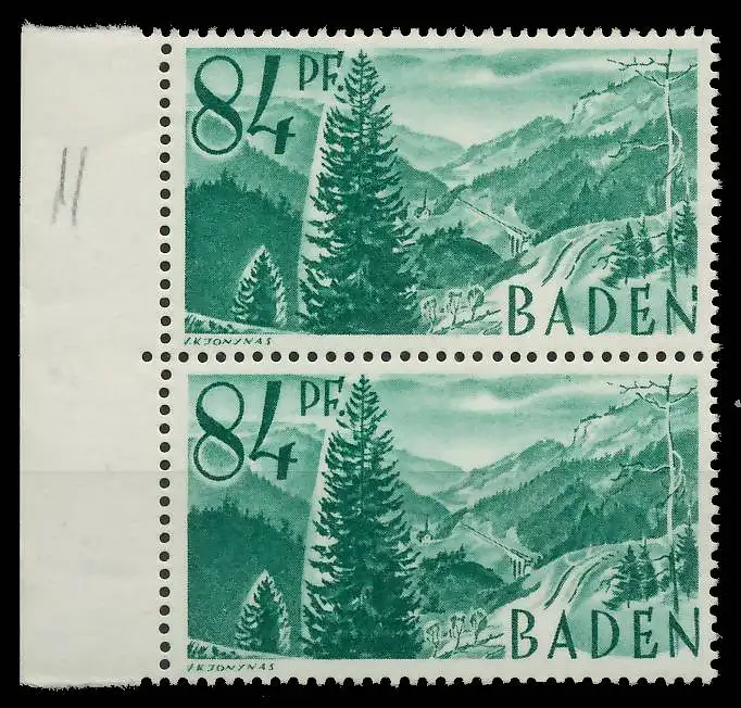 84 Pfg Freimarken Persönlichkeiten und Ansichten aus Baden 1. Ausgabe, senkrechtes Paar mit PF II, gebochenes "N" von Baden, Feld 26 und Normalmarke Type I