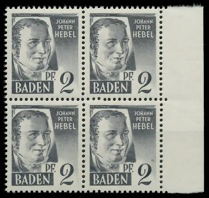 2 Pfg Freimarken Persönlichkeiten und Ansichten aus Baden 1. Ausgabe, 4er Block aus Reihe 9 und 10