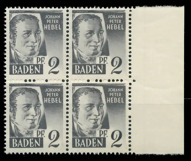 2 Pfg Freimarken Persönlichkeiten und Ansichten aus Baden 1. Ausgabe, 4er Block aus Reihe 9 und 10