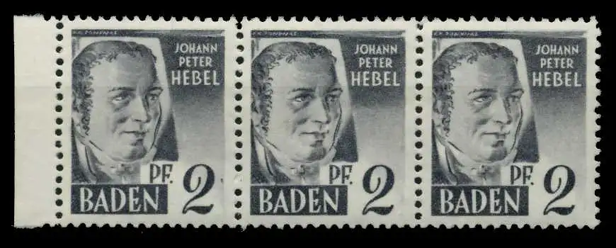 2 Pfg Freimarken Persönlichkeiten und Ansichten aus Baden 1. Ausgabe, im 3er Streifen vom linken Rand, Reihe 1 und 2 Type I, Reihe 3 Type II