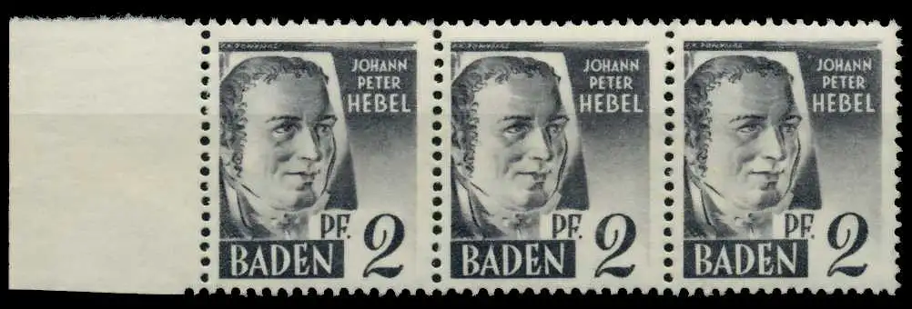 2 Pfg Freimarken Persönlichkeiten und Ansichten aus Baden 1. Ausgabe, im 3er Streifen vom linken Rand, Reihe 1 und 2 Type I, Reihe 3 Type II