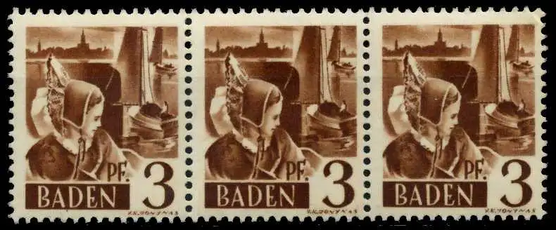 3 Pfg Freimarken Persönlichkeiten und Ansichten aus Baden 1. Ausgabe, 3er Streifen mit allen 3 Typen