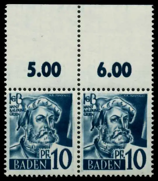 10 Pfg Freimarken Persönlichkeiten und Ansichten aus Baden 1. Ausgabe, waagerechtes Typenpaar mit Oberand