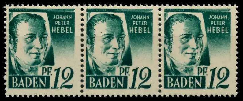 12 Pfg Freimarken Persönlichkeiten und Ansichten aus Baden 1. Ausgabe, dickes gelblich-graues rauhes Papier, waagerechter 3er Streifen mit allen drei Typen