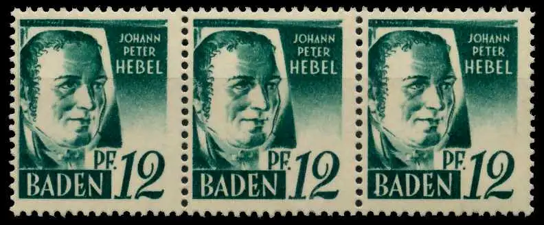 12 Pfg Freimarken Persönlichkeiten und Ansichten aus Baden 1. Ausgabe, dickes gelblich-graues rauhes Papier, waagerechter 3er Streifen mit allen drei Typen