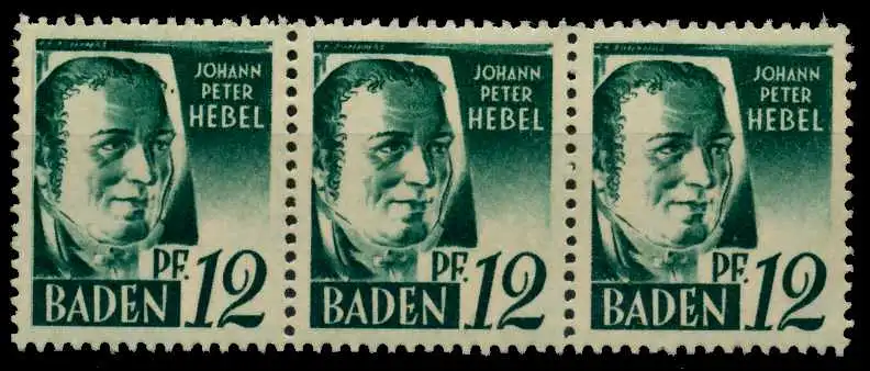 12 Pfg Freimarken Persönlichkeiten und Ansichten aus Baden 1. Ausgabe, dickes gelblich-graues rauhes Papier, waagerechter 3er Streifen mit allen drei Typen