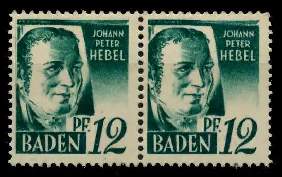 12 Pfg Freimarken Persönlichkeiten und Ansichten aus Baden 1. Ausgabe, dickes gelblich-graues rauhes Papier, waagerechtes Typenpaar (Type I und III)