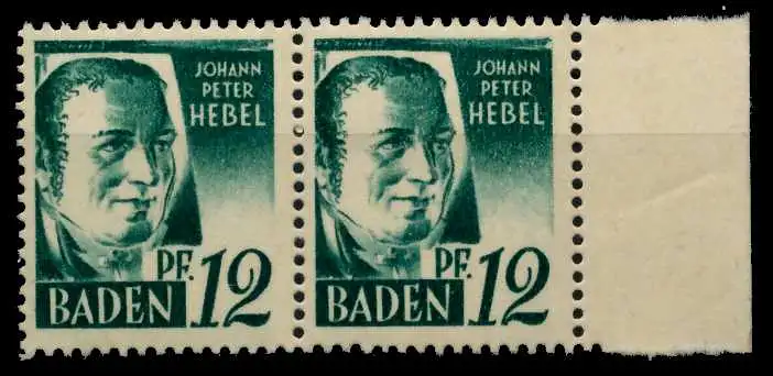 12 Pfg Freimarken Persönlichkeiten und Ansichten aus Baden 1. Ausgabe, dickes gelblich-graues rauhes Papier, waagerechtes Typenpaar (Type I und II)