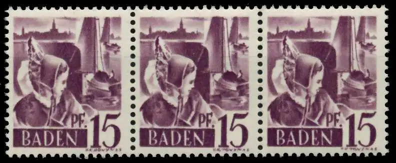 15 Pfg Freimarken Persönlichkeiten und Ansichten aus Baden 1. Ausgabe, 3er Streifen mit allen Typen