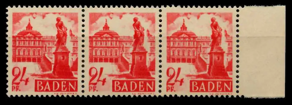 24 Pfg Freimarken Persönlichkeiten und Ansichten aus Baden 1. Ausgabe, 3er Streifen mit den Typen II, IV und V