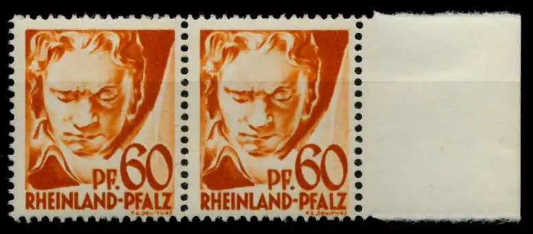60 Pfg Freimarken Persönlichkeiten und Ansichten aus Rheinland-Pfalz 1. Ausgabe, waagerechtes Typenpaar Reihe 9+10 = Type V und IV, vom rechten Bogenrand