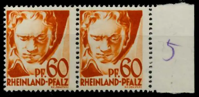 60 Pfg Freimarken Persönlichkeiten und Ansichten aus Rheinland-Pfalz 1. Ausgabe, waagerechtes Typenpaar aus Reihe 9+10 / Type V und IV, vom rechten Bpgenrand