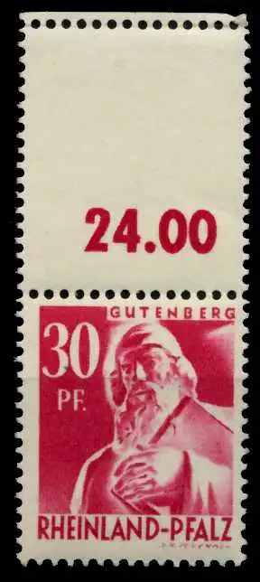 30 Pfg Freimarken Persönlichkeiten und Ansichten aus Rheinland-Pfalz 1. Ausgabe, Oberrand mit kompl. Leerfeld