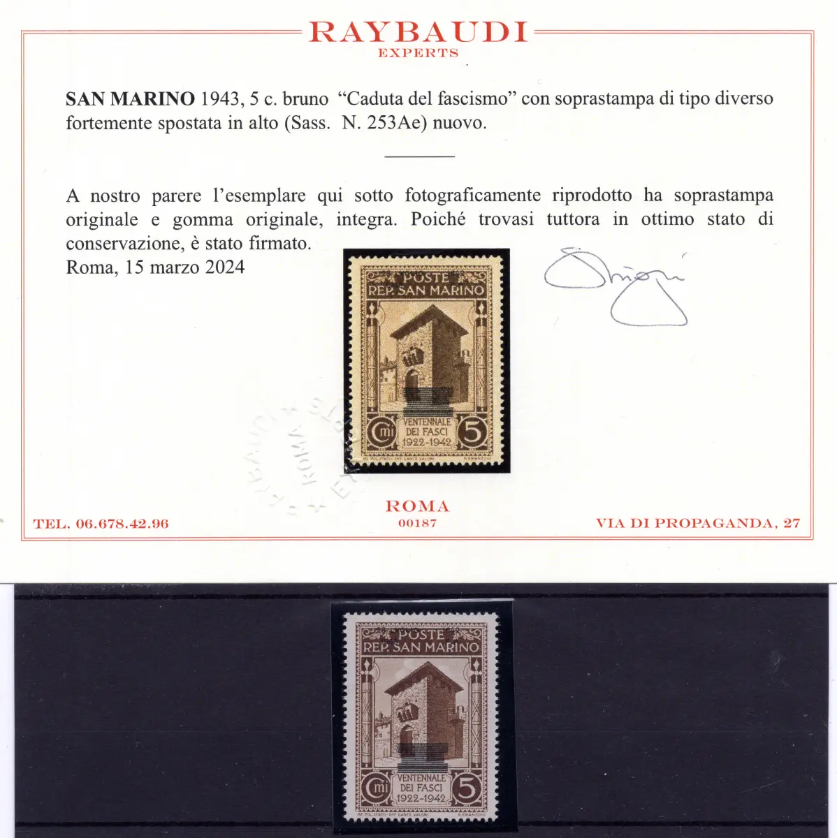 Fall des Faschismus Cent. 5 Aufdrucke verschiedener Sorte Vollgummi - MHN - - Fall des Faschismus Cent. 5 n. 253Ae Aufdruck verschiedener Art stark nach oben verschoben - Sehr Selten - Zert. Ray. - Kat. euro 3.000 Cod. 957/14