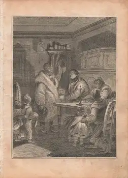 Familie zu Tisch original Stahlstich um 1860