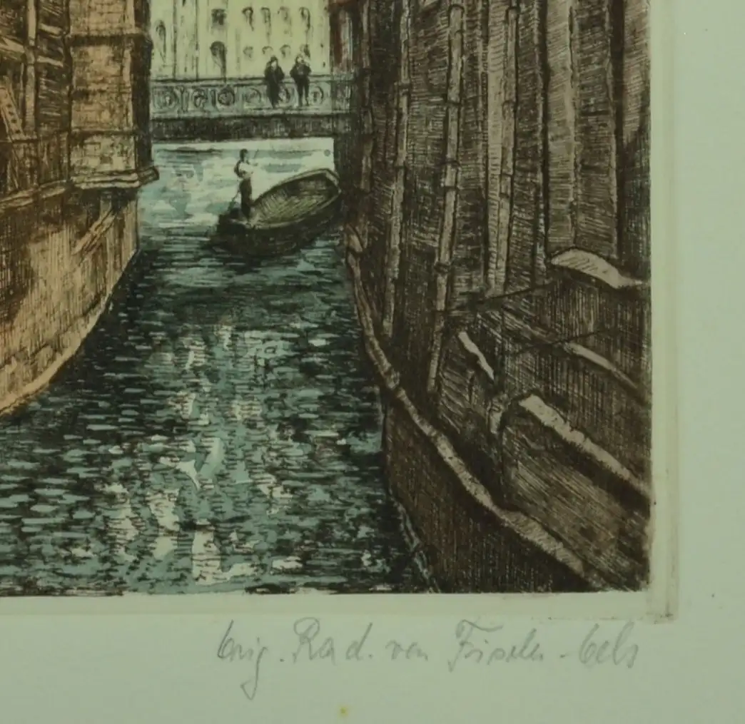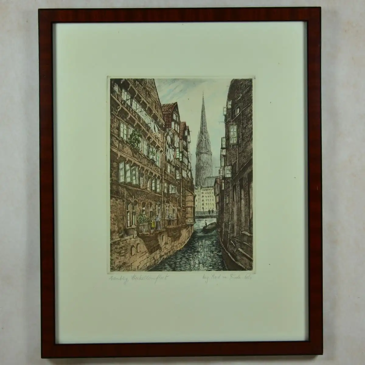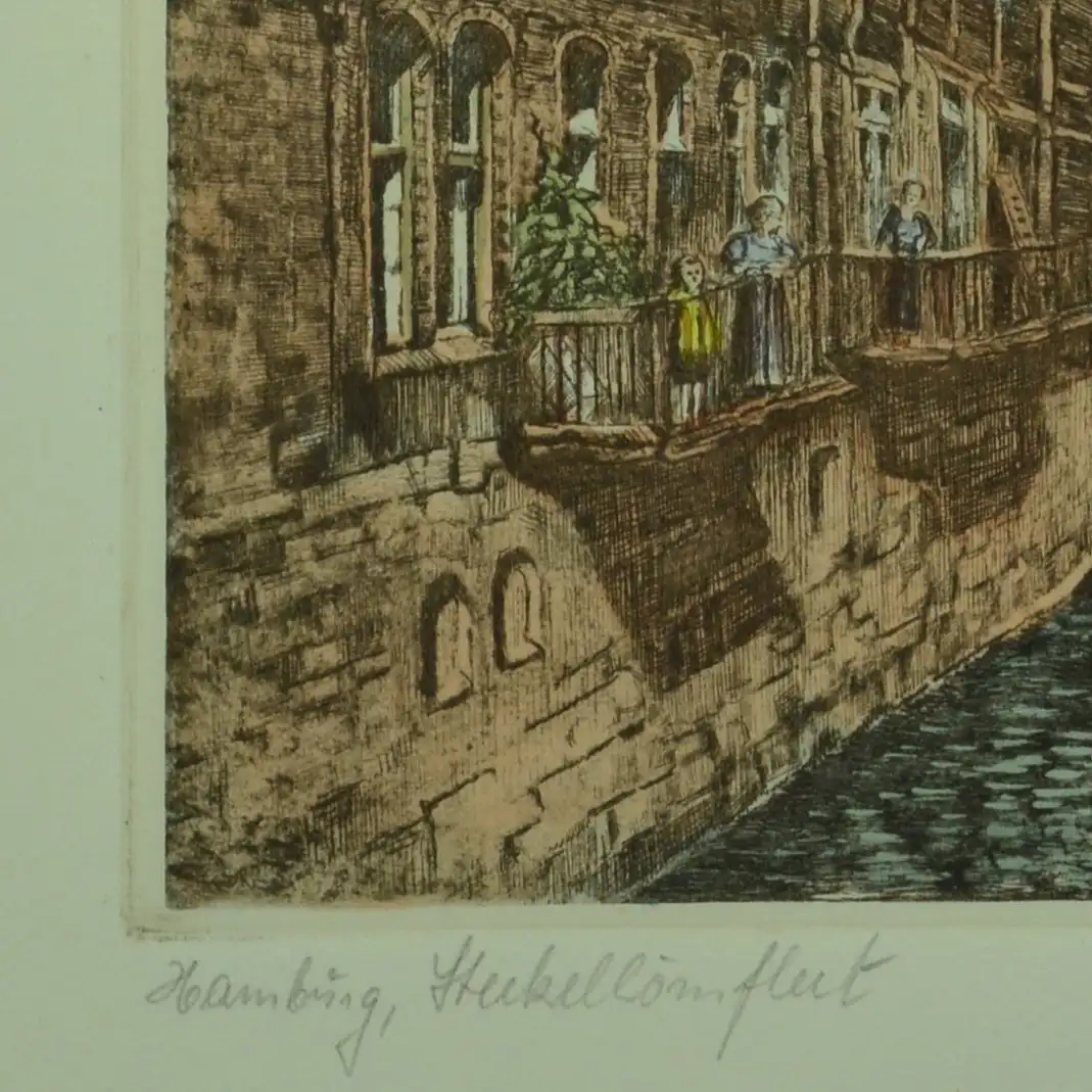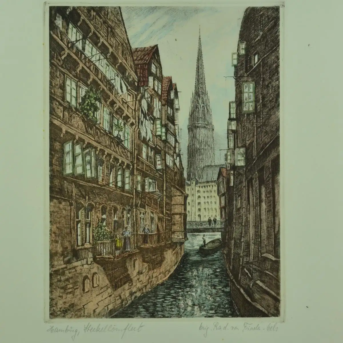 Farbradierung von Helma Fischer-Oels, signiert, zeigt den Steckelhörnfleet mit Blick auf St. Nikolai in Hamburg, 1920er Jahre. Sehr guter Zustand. Ideal für Sammler von Hamburger Kunst oder als dekorativer Akzent.