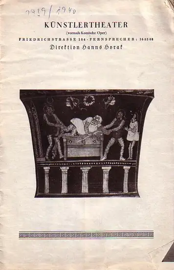 Titel: Programm - Heft zu: Kleopatra die Zweite. Lustspiel in 3 Akten nach Meano von Max Christian Feiler und Herbert Waniek. Musik und Gesangstexte: Alexander Steinbrecher. Inszenierung: Herbert Waniek. Bühnenbild: Heinz Daniel. Kostüme: Max von Formacher. Mitwirkende: Hans Herrmann Schaufuß, Trude Hesterberg, Otto Braml, Hugo Welle, Rudolf Blümmer, Ursula Deinert, Margot Wagner u.a. Aufführung 1939 / 40 in 'Künstlertheater' (vormals Komische Oper), Berlin, Friedrichstrasse 104. Direktion: Hanns Horak