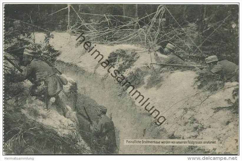 Feindliche Drahtverhaue werden von unseren Feldgrauen erstürmt - Feldpost (E16053) gel. 1917
