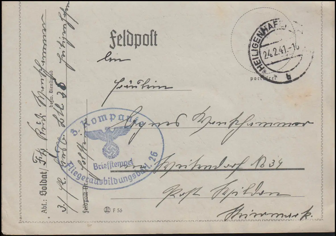 Feldpost 3. Kompanie Fliegerausbildungsbatl. 26, HEILIGENHAFEN (HOLST.) 24.2.41