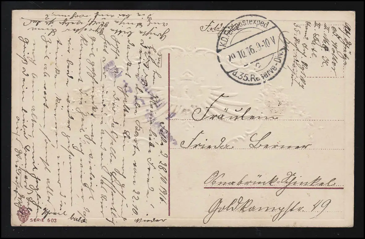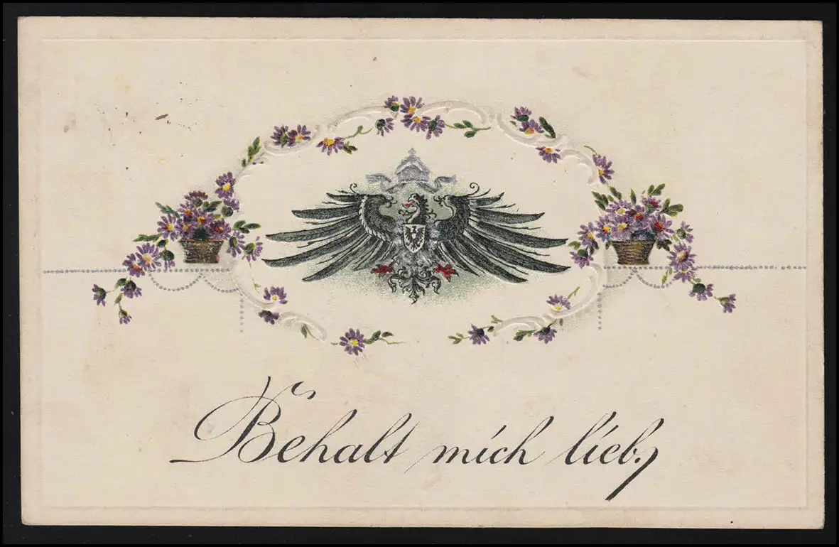 Feldpost-AK Behalt mich lieb: Adler mit Wappen, Feldpost 35. Res.-Div. 29.10.16