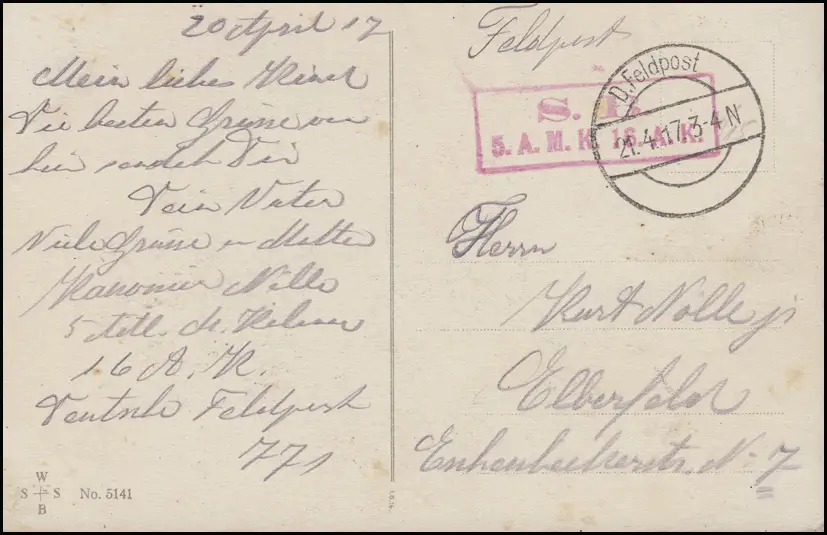 Feldpost AK Ringelreih, S.B. 5.A.M.K. 16.A.K., D. FELDPOST 21.4.17 n. Elberfeld