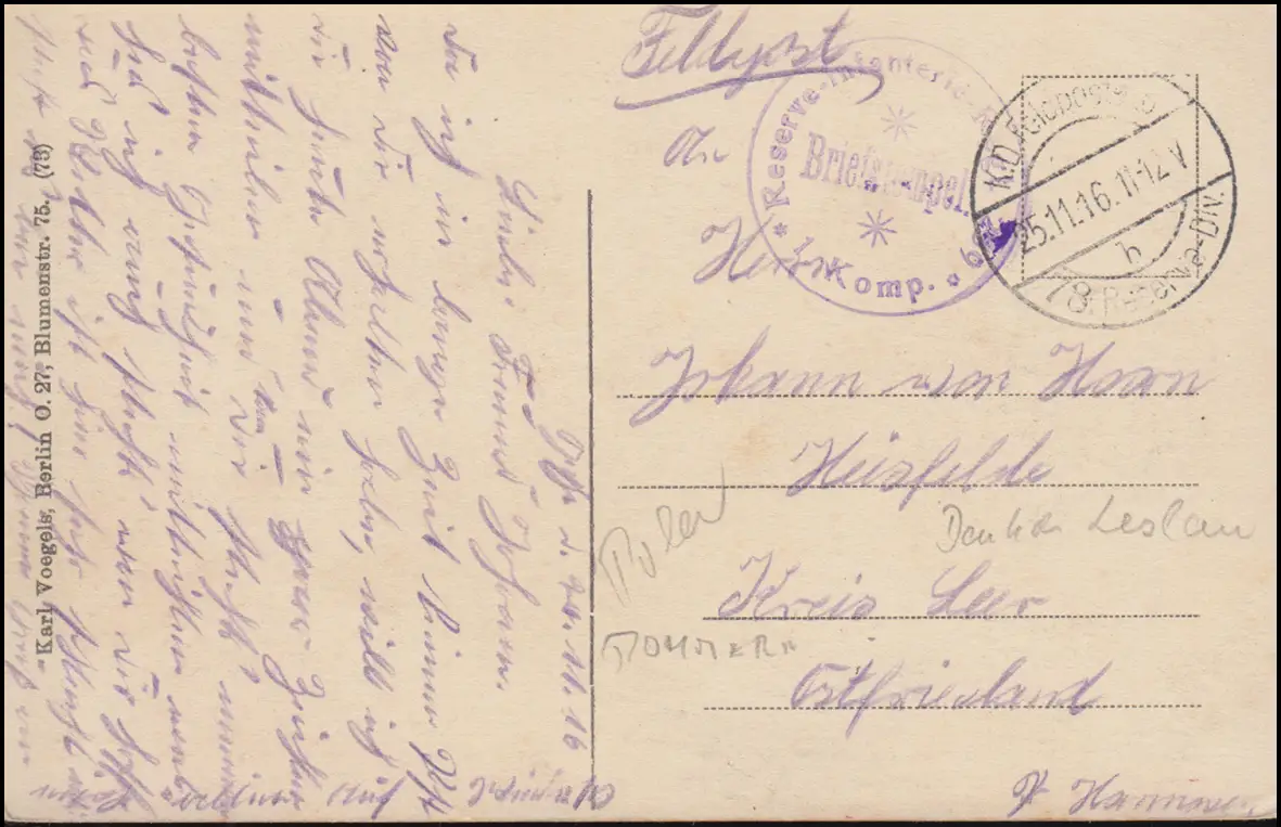 Feldpost BS 1. Komp. Reserve-Infanterie-Regiment 259 auf AK, Feldpost 25.11.1916