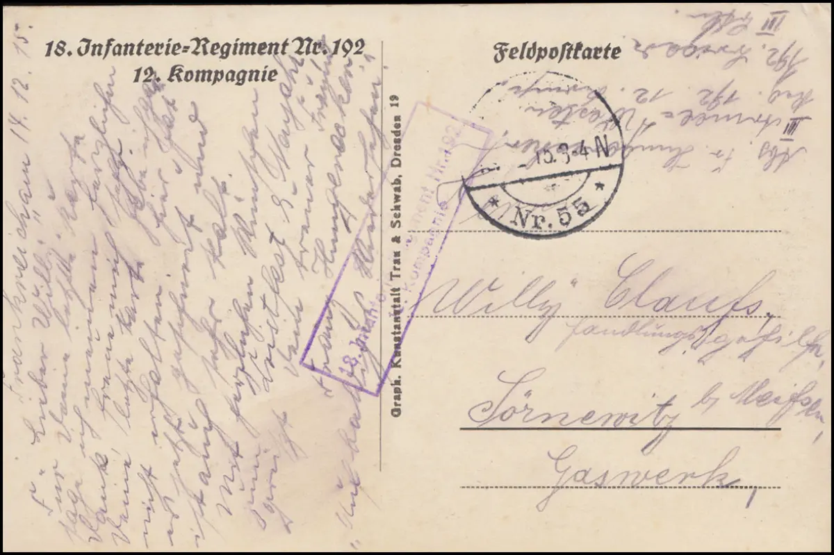 Feldpost BS 18. Infanterie-Regiment Nr. 192 FELDPOST 55 - 14.12.15 auf Kriegs-AK