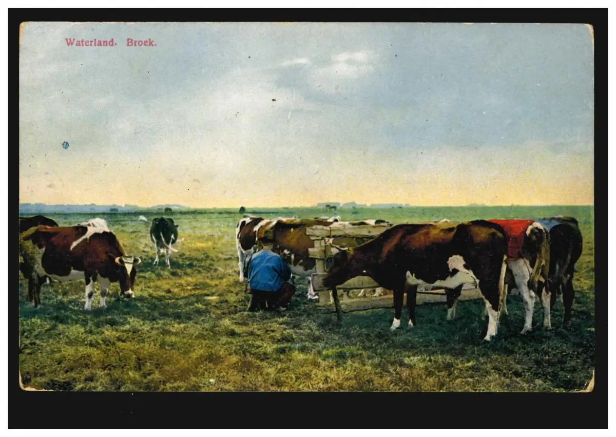 Ansichtskarte Waterland Broek - Bauer beim Melken seine Kühe auf dem Feld