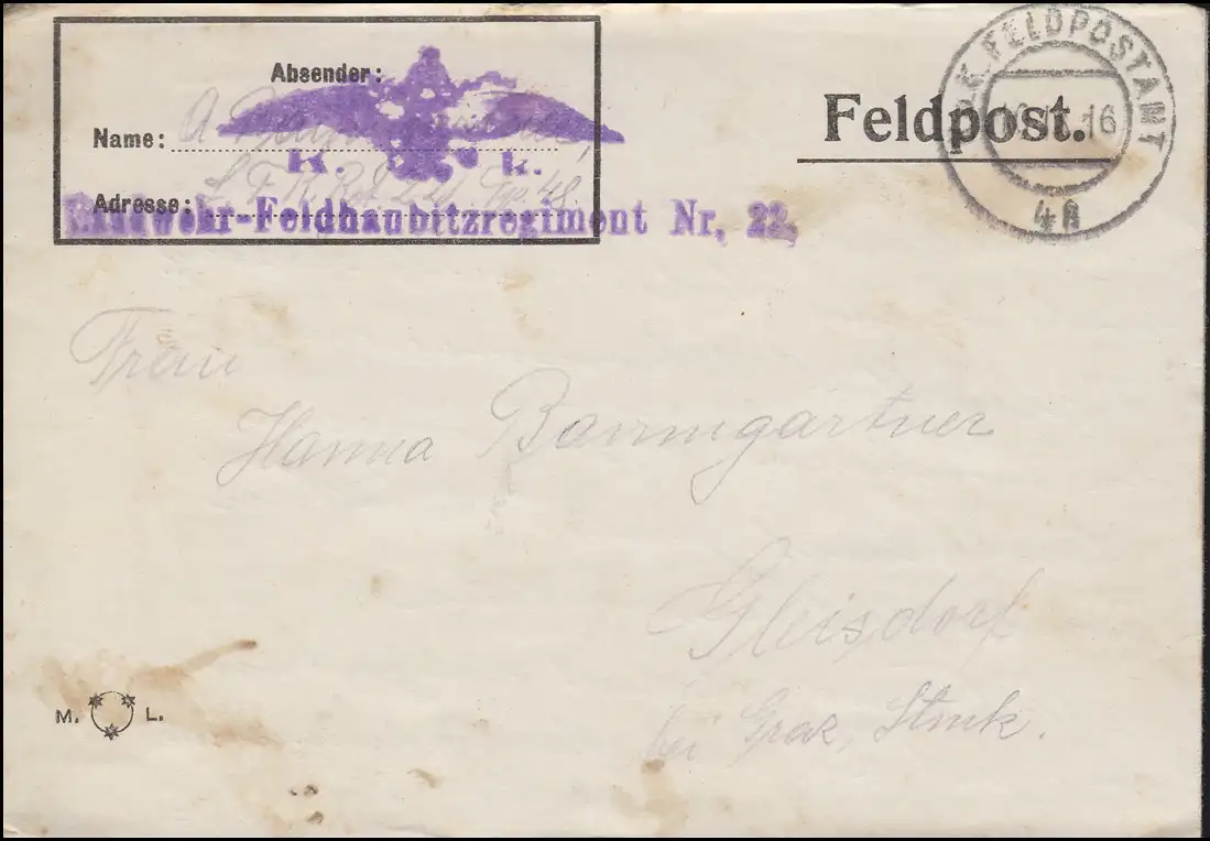 Feldpost BS Landwehr-Feldhaubitzregiment 22, Brief K.u.K. FELDPOSTAMT 48 (1916)