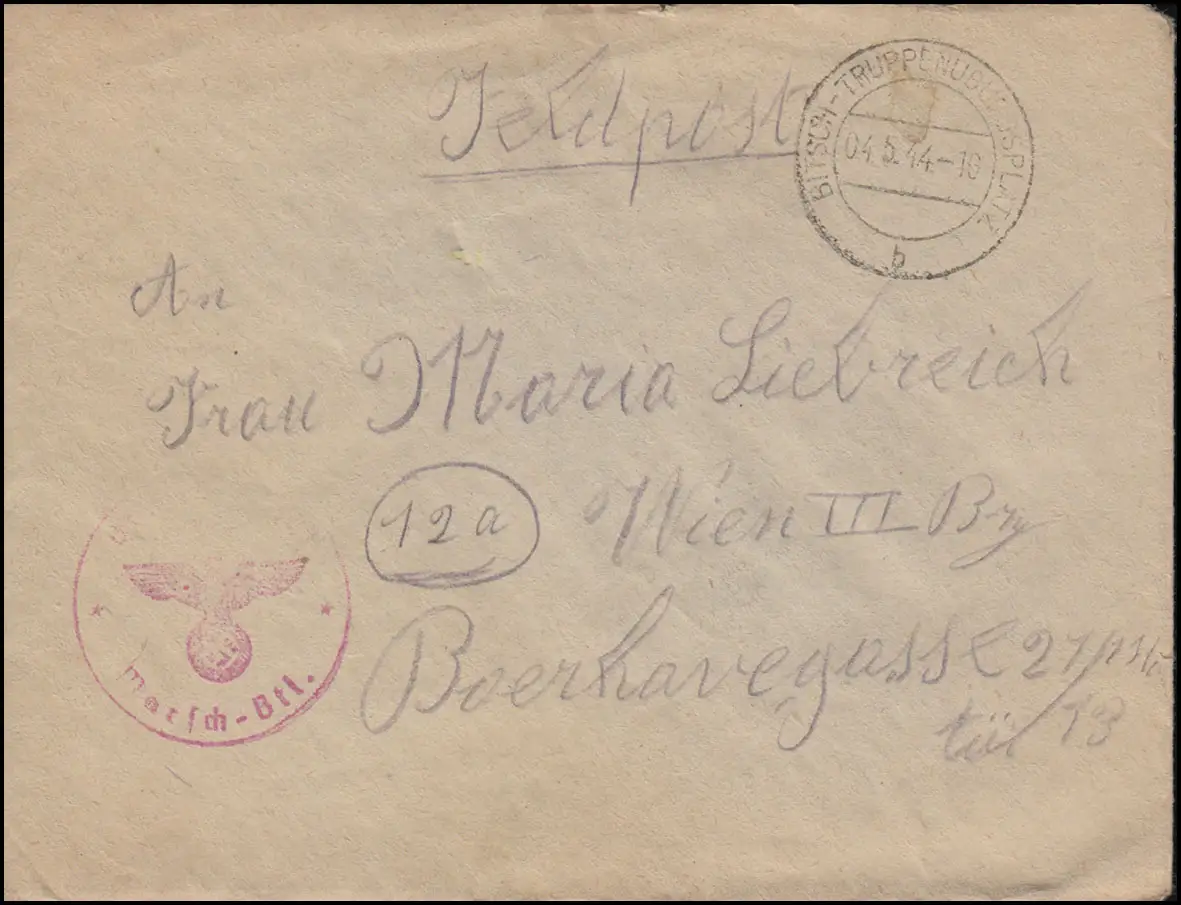Feldpost BS Marsch-Bataillion Brief BITSCH-TRUPPENÜBUNGSPKATZ 4.5.1944 nach Wien