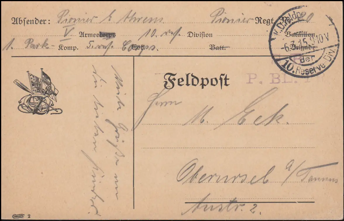 Feldpost BS Pionier-Bataillon Transport-Regiment P.BL.TR. 6.3.15 auf Postkarte