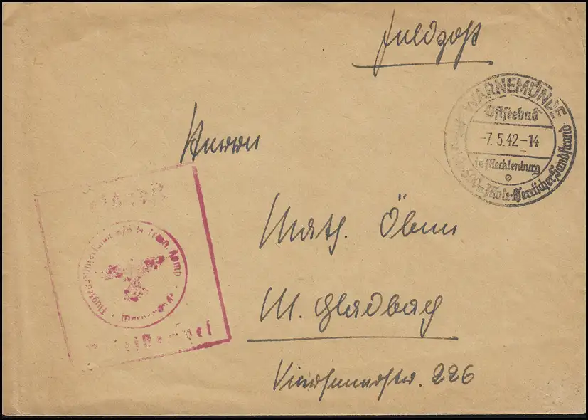 Feldpost Briefstempel Flugzeugführerschule A/B 10, Brief SSt WARNEMÜNDE 7.5.42