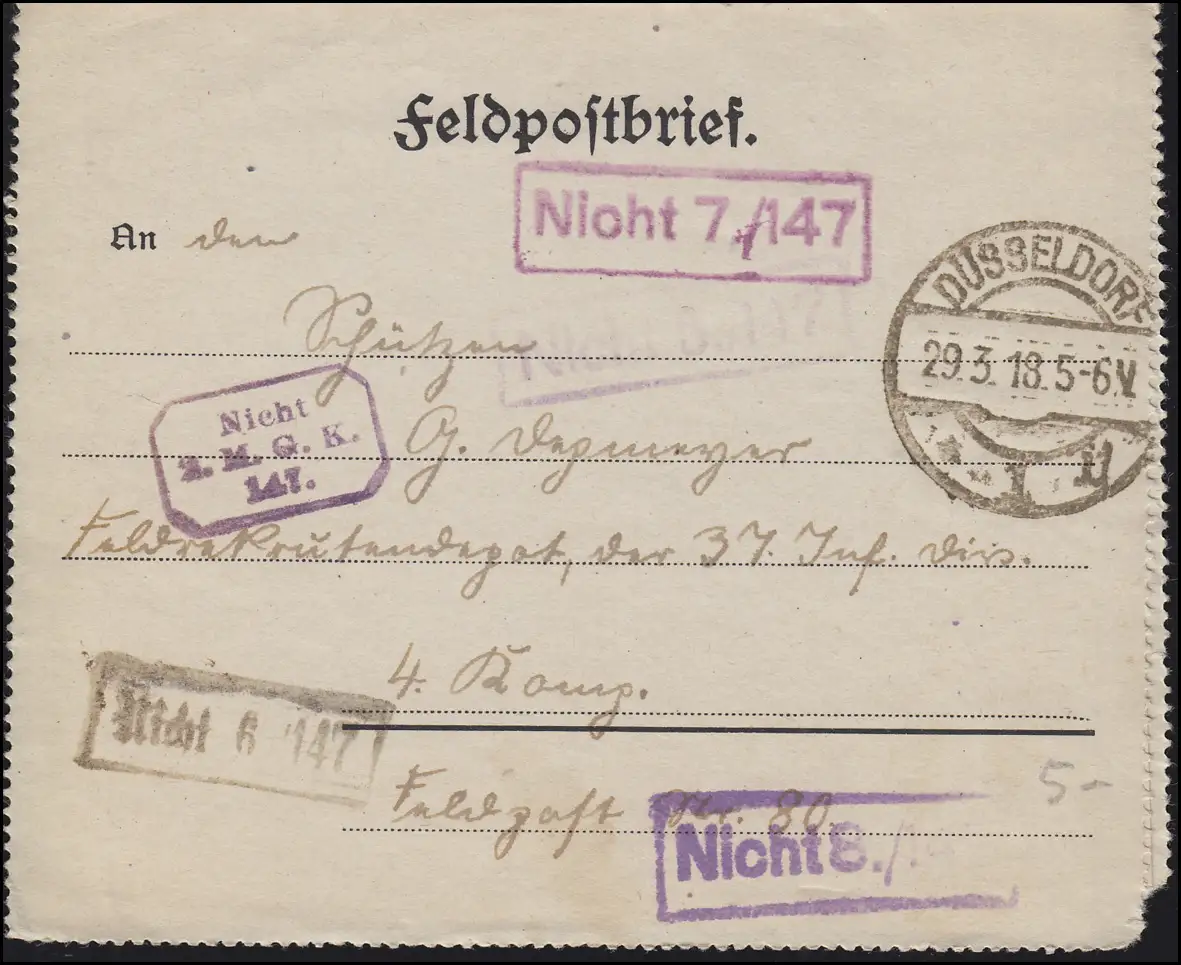 Feldpost DÜSSELDORF 29.3.1918 an die Front - mehrfach nachgesendet