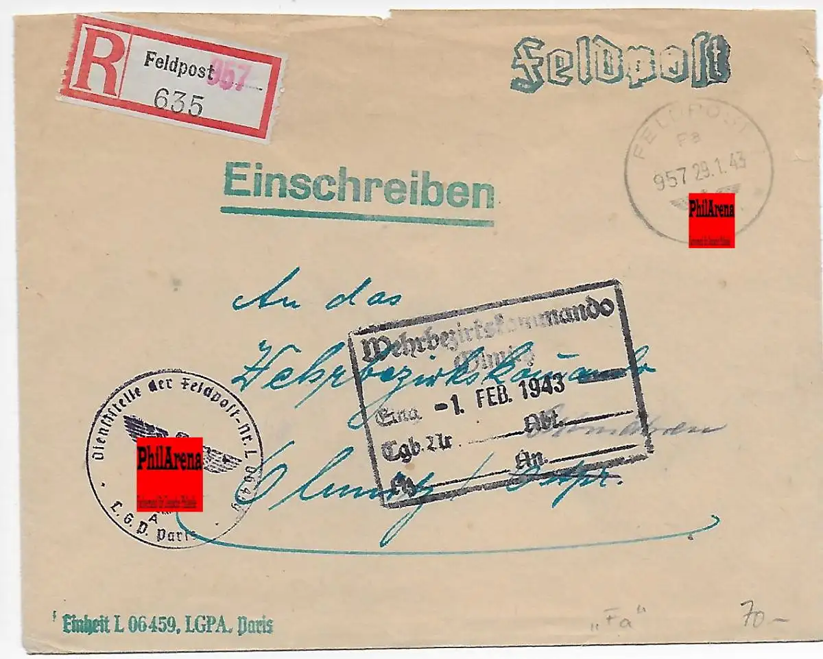 Feldpost: Einschreiben FPNr. L06459 Paris nach Chemnitz 1943