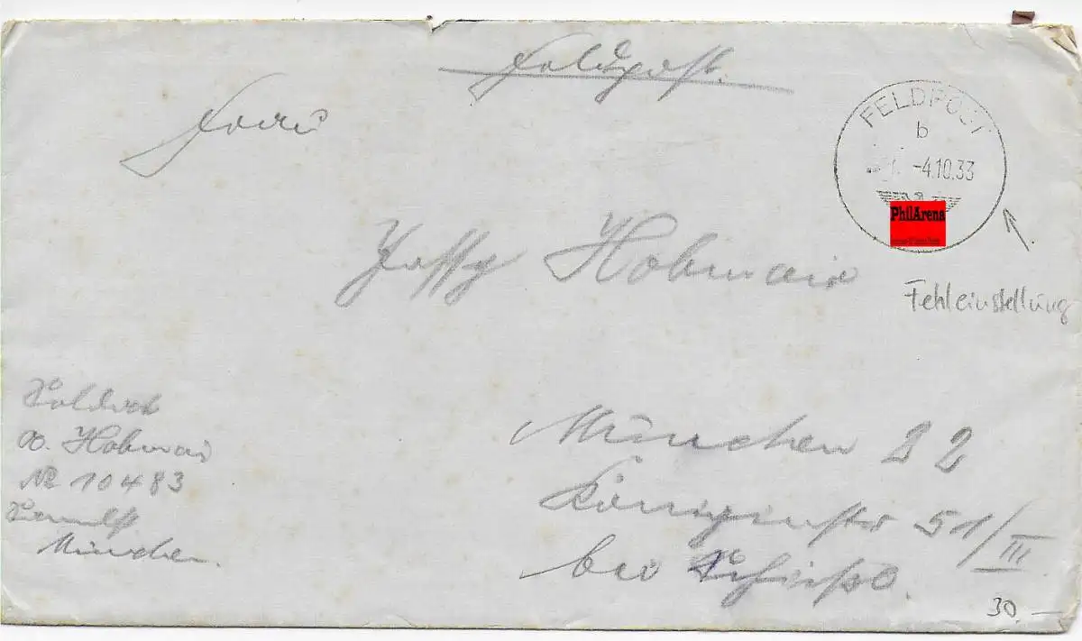 Feldpost: FPNr. 10483 nach München, Stempel Fehleinstellung: 4.10.1933 !!!