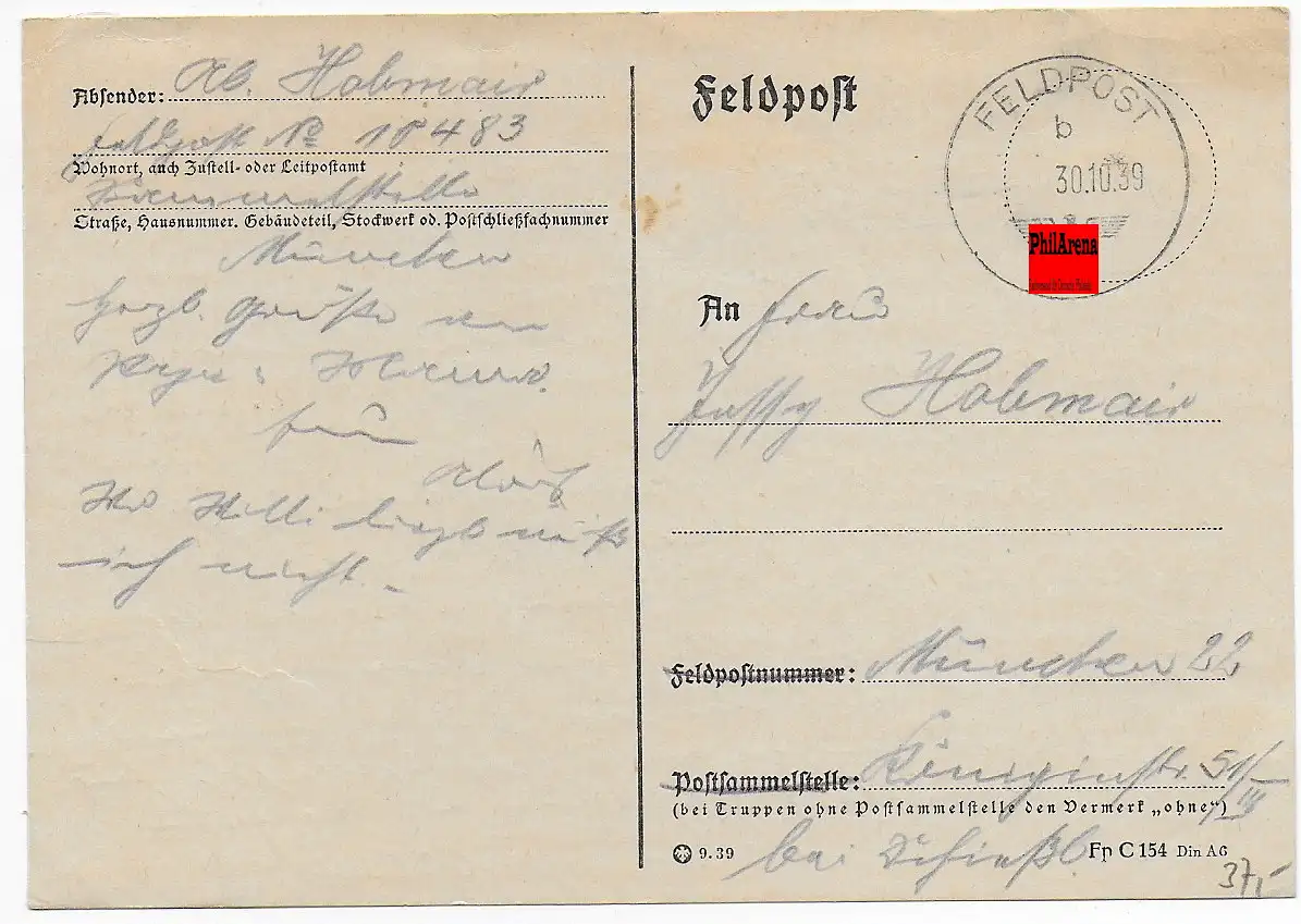 Feldpost: FPNr. 10483 vom 30.10.1939, frühe Feldpost nach München