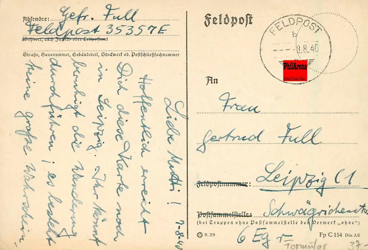 Feldpost: FPNr. 35357E vom 8.8.40 nach Leipzig